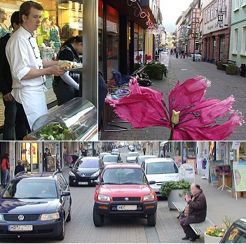 Business as usual - Kein Einkaufsrummel am langen Donnerstag In der Bahnhofstraße waren deutlich mehr Autos als Kunden unterwegs. Oben links: Das Hotel Krone-Post servierte Leckereien vor dem Modehaus Müller, rechts ein Blick in die Hauptstraße am frühen Abend. (Fotos: Hubert Richter)(cr) Viel Platz zum Shoppen gab es gestern für die Kunden am langen Einkaufsabend der Eberbacher Werbegemeinaschaft (EWG). Beim "XXL-Ostershopping" waren viele Geschäfte in der Innenstadt bis 21 Uhr geöffnet, aber der erhoffte Einkaufsrummel blieb aus.