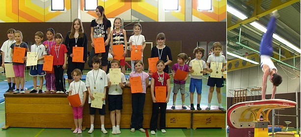 TVE-Turnabteilungen ermittelten ihre Besten Die Bestplatzierten der Allgemeingruppen nach der Siegerehrung, rechts ein Teilnehmer der Fördergruppe beim Sprung. (Fotos: Hubert Richter)(hr) In der Ittertal-Sporthalle ermittelten gestern Nachmittag die jungen Turnerinnen und Turner des TV Eberbach ihre Vereinsmeister. Rund 30 Helferinnen und Helfer sorgten für einen reibungslosen Ablauf der Veranstaltung, bei der gut 125 Mädchen und Jungen an den Geräten im Kampf um Urkunden, Medaillen und Pokale ihr Bestes gaben.