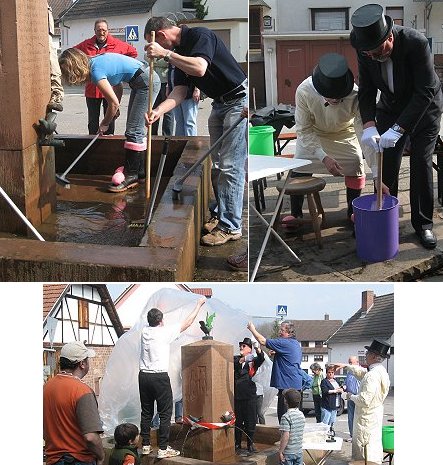 Unter fachkundiger Anleitung der Zuschauer wurde geschrubbt, gerubbelt, gewienert und poliert. Der Präsident der KG Urmel Joachim Schwab kümmerte sich höchstpersönlich um die ungehinderte Wasserzufuhr und der Vize-Präsident der KG Kuckuck Markus Scheurich rückte in Funktion eines "Brunnebutzer" mit einer Spezialpaste dem Grünspan zu Leibe.
