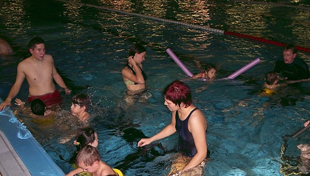 Beim Montagstraining, das über Winter ab 19 Uhr im Eberbacher Hallenbad stattfindet, ist aufgrund der unterschiedlichen Ausbildungen ein "reges Wuseln auf allen Bahnen" zu beobachten. Bis zu 90 Teilnehmer befinden sich während der beiden Trainingsstunden im Schwimmbecken, eine Zahl, die langsam die Kapazitätsgrenze des Bades erreicht.