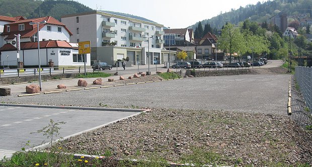 Ab morgen darf geparkt werden (Foto: Nicol Kolbe)(ko) Nach dem Beschluss des Gemeinderats vom Juli 2008 (wir berichteten) wurden zwischenzeitlich auf dem ehemaligen Güterbahnhofareal provisorische Stellplätze durch die Stadtverwaltung eingerichtet. Es entstanden rund 40 neue Parkplätze und 16 Fahrradabstellplätze. Zudem wurde zur Verkehrserleichterung in der Güterbahnhofstraße eine weitere Ausfahrt aus dem REWE-Marktgelände geschaffen, um den abfließenden Verkehr in Stoßzeiten zu verbessern.