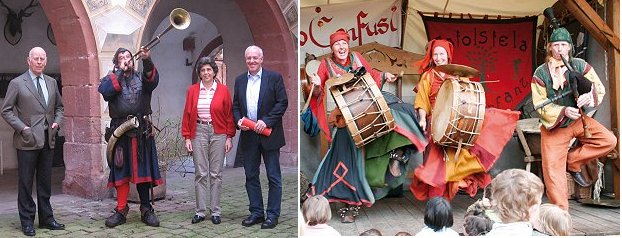 Zweites mittelalterliches Spektakel auf Schloss Zwingenberg - Freikarten zu gewinnen Prinz Ludwig von Baden (l.) und Prinzessin Marianne von Baden mit Bürgermeister Peter Kirchesch und "Büttel Molinarius" sowie die Gruppe "Satolstelamanderfanz", die auch in diesem Jahr wieder dabei sein wird. (Fotos: Nicole Kolbe / privat)(ko) Am 25. und 26.April laden Prinz Ludwig von Baden und seine Frau Prinzessin Marianne zum zweiten Burgfest auf Schloss Zwingenberg ein. Nachdem das erste Burgfest im vergangenen Jahr mit über 2.000 Besuchern sehr erfolgreich verlaufen war, entschloss man sich auch in diesem Jahr, Schloss Zwingenberg für zwei Tage ins Mittelalter zurück zu versetzen.