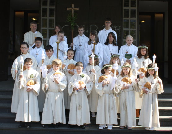Weißer Sonntag in St.Josef Die stolzen Erstkommunikanten nach dem Gottesdienst.(Foto: Mauritius Schell)(mts) „Manchmal feiern wir mitten am Tag ein Fest der Auferstehung“ - mit diesem Lied begann bei strahlendem Sonnenschein für zwölf Mädchen und Jungen am 19. April der „Weiße Sonntag“ in der Pfarrei St. Josef.