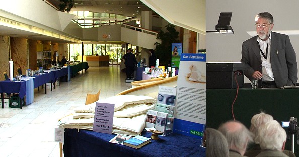 Während der Tagung ist im Foyer der Stadthalle eine Ausstellung mit Wünschelruten, Pendeln, Messgeräten, Fachliteratur und Gesundheitsprodukten zu sehen (unser linkes Bild).