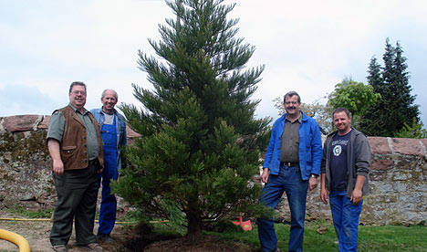 Bauhöfe kooperieren bei Pflanzaktion Unser Bild zeigt von links nach rechts: Ortschaftsrat Wolfgang Grimm, Willi Krieger (Leiter des Bauhofes), Ortsvorsteher Paul Scholl und Michael Mittmesser (Bauhof-Landschaftsgärtner) mit einem der beiden neu gepflanzten Mammutbäume. (Foto: privat) (hof) Immer wieder stand der Strümpfelbrunner Friedhof in den vergangenen Jahren im Mittelpunkt der Bemühungen des Ortschaftsrats. Nach der Sanierung der Kapelle standen zahlreiche weitere Arbeiten auf dem Programm, wovon viele vom Ortschaftsrat ehrenamtlich geleistet bzw. finanziert wurden.