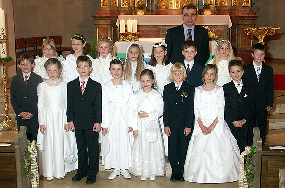 Das Foto zeigt die Waldbrunner Kommunionkinder zusammen mit dem Pfarrer Pavo Ivkic. (Foto: Thomas Baumgartner)(tb) Wie in vielen katholischen Kirchengemeinden schon bereits am Sonntag nach Ostern, feierte man heute in der kath. Pfarrkirche St. Maria in Waldbrunn die Erstkommunion. So waren insgesamt 16 Jungen und Mädchen zur ersten Teilnahme am Mahl Gottes eingeladen.
