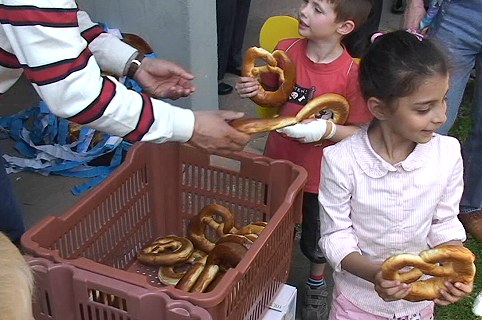 Nach dem heißen Spektakel wurden wieder die beliebten Sommertagsbrezeln verteilt, die je zur Hälfte von Eberbacher Bäckereien und vom Bürger- und Heimatverein gestiftet worden waren.