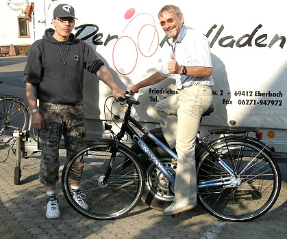 Schuldienstfahrrad am Gymnasium Detlef Fink vom Radladen übergibt das Fahrrad an Dr. Harald Grote (r.) vom HSG. (Foto: privat)(bro) (hg) Gerade bei naturwissenschaftlichen Lehrern am Hohenstaufen-Gymnasium kommt es häufig vor, dass in einer Freistunde irgendetwas in der Stadt zu besorgen oder zu erledigen ist. Da müssen Schlüssel für Waldklassenzimmer oder Jugendbus abgeholt werden, fürs Fotosynthese-Praktikum fehlen noch frische Wasserpflanzen, oder für die Lebensmittelchemie ist die Gelatine ausgegangen. Nun wohnen aber viele Lehrer nicht in Eberbach. Sie reisen morgens mit der S-Bahn an und sind dann vor Ort ziemlich unbeweglich.