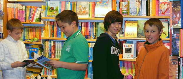 Welttag des Buches - Fünfklässler begeisterten sich fürs Lesen "Jungen lesen zu wenig" - Zumindest am Hohenstaufen-Gymnasium gilt dies bei den Fünfklässlern nicht, die zusammen mit ihren Klassenkameradinnen die Eberbacher Buchhandlung Greif in der Friedrichstraße besuchten. (Foto: privat)