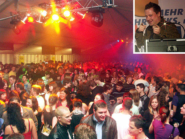 Waldkatzenbach war Zentrum des Wilden Südens Draußen war es kühl, aber im Festzelt des VfR Waldkatzenbach heizte SWR3-DJ Josh Kochhann (r.o.) die Stimmung bei den rund 1.400 gut gelaunten Partyfans mächtig an. (Fotos: Thomas Baumgartner)