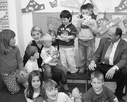 Auch Bundestagsabgeordnerter Dr. Michael Meister besuchte den städtischen Kindergarten Langenthal in seinem vorübergehenden Domizil. Das Gebäude des am 4. Februar abgebrannten Kindergartens "GerneGross“ in Langenthal soll noch bis zum Ende des Jahres wieder aufgebaut und bezugsfertig sein. Und diesmal sogar zweistöckig. Mit ihm soll dem bundesweit angestrebten Verlangen Rechnung getragen werden, bis zum Jahr 2013 so viele Krippenplätze zu schaffen, dass ein Drittel jedes Jahrgangs betreut werden kann.