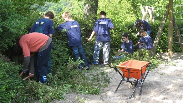 Eine weitere Arbeitsgruppe beschäftigte sich damit, die alten Holzspielgeräte abzuschleifen, damit diese wieder neu gestrichen werden konnten. Außerdem wurden zahlreiche Büsche zurecht geschnitten und der alte Drahtzaun entsorgt, um Platz für einen Neuen zu schaffen.