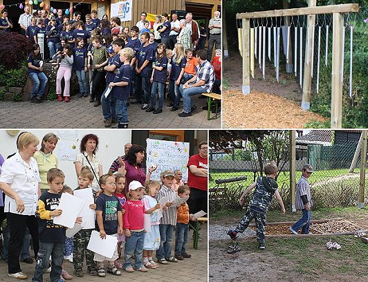 „Geordnetes Chaos“ erfolgreich bewältigt O.l.: Die Gruppe „Just4You“ mit ihren Helferinnen und Helfern. O.r.: Das nagelneu angelegte Klangspiel. U.l.: Die Kindergartenkinder bedankten sich mit einem Lied bei der Gruppe für deren Arbeit. U.r.: Sofort nahmen die Kinder den neu angelegten Sinnespfad in Beschlag. (Fotos: Mauritius Schell)Mehr Bilder (Klicken zum Vergrößern):