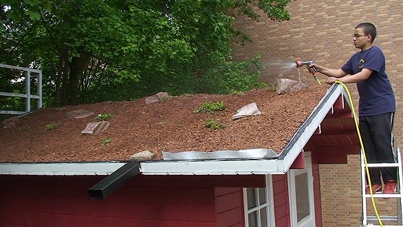 Sozialaktion beendet - Hauptschüler haben ganze Arbeit geleistet Am Freitag musste das frisch begrünte Dach des Gartenhauses gründlich gewässert werden. (Foto: Hubert Richter)Mehr Bilder (Klicken zum Vergrößern):