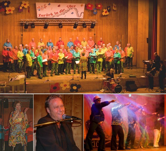 "Back to the 70s" ist ein Projektchor, der sich aus Sängern des großen Chors und einigen Neuzugängen extra für den musikalischen Rückblick formiert und einige Zeit speziell geübt hat. Ihr Können bewiesen die "Projektler" am Samstag dann mit Titeln wie "Let it be" (Beatles), "Girls, Girls, Girls" (Sailor) oder John Denvers "Country Roads".