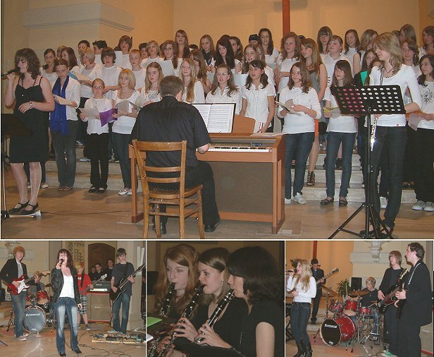 Musik-AGs des HSG präsentierten sich Auf dem oberen Bild die Chor-AG der Klassenstufen 7 und 8 mit ihren Solistinnen und Frank Reinbold am Klavier. Unten v.l. die Rock-AG I, Klarinettistinnen der Big Band und die Rock-AG II "Laid Back". (Fotos:Wörner)(tw) Die Musik-Arbeitsgemeinschaften des Hohenstaufen-Gymnasiums Eberbach gaben am Donnerstagabend in der Michaelskirche im Rahmen des diesjährigen Schulkonzertes einen Einblick in die vielfältige musikalische Arbeit an ihrer Schule.