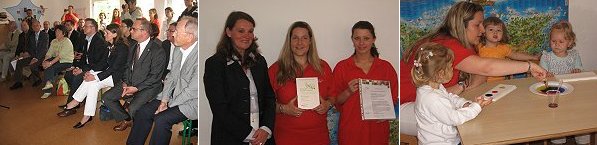 "Spatzennest" erhält Auszeichnung vom "Haus der kleinen Forscher" (Foto links) Die geladenen Gäste, (Foto Mitte) v.l. Christina Rode-Schubert mit Leiterin Julia Jakob und Mitarbeiterin Sarah Wieczorek, (Foto rechts) Julia Jakob mit ihren "Spatzen" beim Experimentieren (Fotos: Nicol Kolbe)(ko) Nicht nur „trocken und satt“ sondern auch „forschen und entdecken“ ist das Motto, das sich die Kinderkrippe „SpatzenNest am Rosenturm“, unter ihrem Vorsitzenden Erich Neuner und der Leiterin Julia Jakob zusammen mit ihren Mitarbeiterinnen, auf ihre Fahnen geschrieben hat.