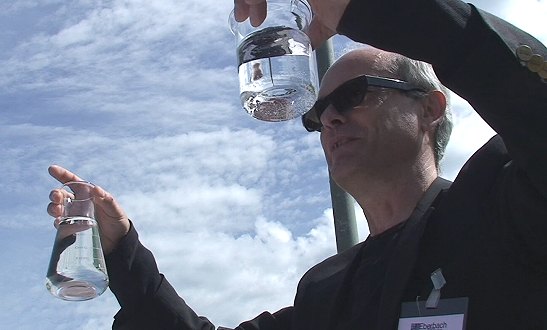 Millionenprojekt nach sechsjährigem Umbau auf dem neuesten Stand Augenscheinlich blitzsauber: Stadtbaumeister Manfred Janner präsentiert geklärtes Eberbacher Abwasser (links) und Trinkwasser aus der Leitung: "Welches Glas darf ich Ihnen anbieten?". (Foto: Hubert Richter)Mehr Bilder (Klicken zum Vergrößern):