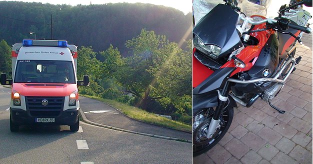 Die BMW kollidierte links hinten mit dem Kleinbus und fiel auf den talseitigen Gehweg. Der Fahrer des Zweirads verletzte sich dabei so schwer, dass er in die Chirurgie nach Heidelberg gebracht werden musste. Zunächst war der Transport per Rettungshubschrauber vorgesehen. Da jedoch beide angefragten Helikopter anderweitig belegt waren, musste die Fahrt im Rettungswagen erfolgen.