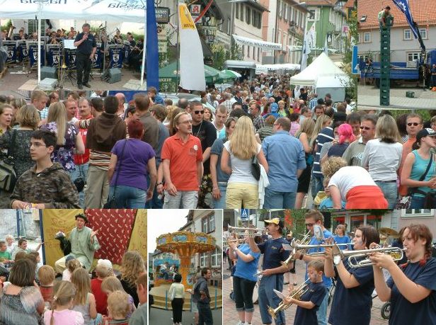 Buntes Treiben beim Brunnenfest in der Stadt am Berge Blick von unterhalb der Mümlingquelle. Bild im Bild oben links, die Feuerwehrkapelle Beerfelden, rechts Kistenstapeln des THW. Unten von links der Puppenspieler, ein Kinderkarussell und die "Gugga-Party-Band Michelstadt". (Fotos:Wörner)(tw) Bei weitgehend schönem Frühlingswetter feierten die Beerfelder heute zum 19. Mal ihr Brunnenfest. Die bunte Mischung mit geöffneten Geschäften, vielfältigen Verkaufsausstellungen von Handel, Handwerk und Gewerbe und einem abwechslungsreichen Unterhaltungsprogramm lockte auch heute wieder viele Besucher aus nah und fern nach Beerfelden. Dazu gehörte auch ein bestens sortierter Flohmarkt, zahlreiche Angebote für Kinder und Jugendliche und Musik für fast jeden Geschmack. An kulinarischen Angeboten unter anderem mit einem viele Meter langen Erdbeerkuchen fehlte es ebenso wenig wie an Sport- und Bewegungsangeboten wie dem vom Skiclub organisierten Stadtlauf oder dem Kistenstapeln beim THW.