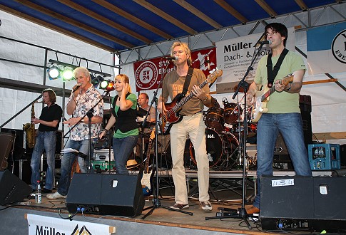 Zeitgleich zog der Leopoldsplatz mit seinen zahlreichen Rock-Pop Gruppen die Menge an. Den Anfang machte am Samstagabend um 19 Uhr die Jugendband „Laid Back“. Mit ihrer Frontsängerin Jessica Mühlfeld, Gitarrist Maxime Schleyer, Bassist Benedikt Held, Keyborder Florian Gattermeier und Schlagzeuger Patrick Mühlfeld sorgten sie mit Coversongs wie „Walking on Sunshine“ von Katrina And The Waves dafür, dass sich der anfangs erschreckend mager besuchte Platz am Rathaus immer mehr füllte und in den späten Abendstunden des Sonnabends komplett mit gutgelaunten Menschen gefüllt war. Nach einem gut 45-minütigen Auftritt und einer vom Publikum geforderten Zugabe wurde die noch junge Band von der „Freddy-Wonder-Combo“ abgelöst. Diese aus dem nahen Heidelberg stammende Coverband mit Frontsänger und Namensgeber Freddy Wonder profitierte von dem angelockten Besucherstrom und brachte mit zahlreichen Klassikern das Publikum aller Altersgruppen zum „abrocken“.