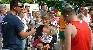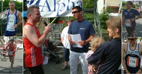 Hohe Temperaturen machten den Athleten zu schaffen Halbmarathonsieger Jörg Richter (l.o.), Dritter des Halbmarathons, der Eberbacher Guiseppe Mammone (l.u.). Moderator Armin Kapell mit Schirmherrin Angelika Merkel und Bürgermeister Bernhard Martin bei der Begrüßung zu Beginn der Läufe. Geschwister Tina und Thomas Tremmel die Sieger beim 10-km-Lauf (r.o. und r.u.). (Fotos:Wörner)Mehr Bilder (Klicken zum Vergrößern):