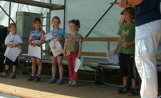 Hohe Temperaturen machten den Athleten zu schaffen Bambinis (Die Gelben) bei der Siegerehrung. (Foto: Wörner)Mehr Bilder (Klicken zum Vergrößern):