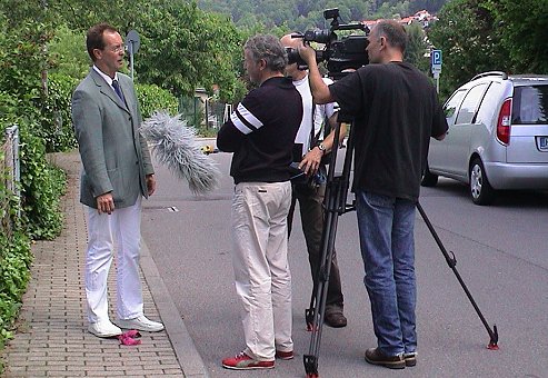 Notarzt wird zum Fernsehstar Das Fernsehteam beim Interview mit Dr. Mathias Schmidt, Chefarzt der Anästhesie in Eberbach. (Foto: Claudia Richter) (cr) Eberbacher Notarztfahrzeug mitsamt Notarzt Bestandteil einer Doku-Soap