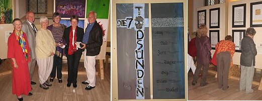 SCHRIFTSPIEL fasziniert mit den sieben Todsünden (links) die anwesenden Künstlerinnen und Künstler, (Mitte) das Werk von Ulrike Malige, (rechts) interessierte Besucher (Fotos: Nicol Kolbe)(ko) Es ist schon spannend die sieben Todsünden mit den Augen der Künstler der Deutsch-Schweizer Kalligrafen-Gruppe SCHRIFTSPIEL zu sehen. So ist es sicher auch den zahlreichen kunstinteressierten Besuchern am vergangenen Donnerstagabend gegangen, die sich zur Eröffnung der Ausstellung kalligrafischer Arbeiten der Gruppe SCHRIFTSPIEL in der Michaelskirche einfanden.