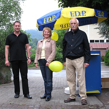 FDP stellte sich den Fragen der Bürger (Foto: privat)(bro) (hb) Der Infostand der FDP Kreistagskandidaten im Wahlkreis Eberbach am 28. Mai auf dem Leopoldsplatz war rege besucht. Vor Ort stellten sich den Besuchern Helga Bender (Listenplatz sechs), Dr. Heinz Bahnmüller (Listenplatz sieben) und Sebastian Löb ( Listenplatz drei) den Fragen der Besucher. Dabei erläuterten sie auch das FDP- Wahlprogramm. Es wären vor allem vier Bereiche, auf die sich die Fragen erstreckten und die auch die Schwerpunkte bei der FDP auf Kreistagsebene sind: die Berufs- und Sonderschulen, die Gesundheitseinrichtungen und Sozialhilfe, die Mobilität und die Energie- und Abfallwirtschaft.