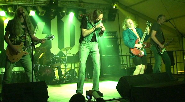 Höhepunkt des Jubelwochenendes war dann am Abend ein Rockfestival im Festzelt mit einer der angesagtesten AC/DC-Coverbands der Region. "AC/ID" schafften es in einer über zweistündigen Show, die Fans der australischen Hardrocker zu begeistern. Die Band kam dem Original sowohl soundmäßig als auch mit ihrer Performance ziemlich nahe. Sologitarrist Ralf Keßler gab in der Schuluniform mit kurzen Hosen eine überzeugende Angus-Young-Kopie, legte wie sein Vorbild einen Striptease hin und bahnte sich anschließend für sein Gitarrensolo den Weg durchs Publikum. Frontmann Joe Strubel ließ vor allem den verstorbenen ersten AC/DC-Sänger Bon Scott wiederauferstehen, hatte aber stimmlich auch mit den Songs von Brian Johnson einschließlich der neuen Single "Rock ´n´ Roll Train" keine Probleme. Bassist Stefan Schiemer und Drummer Jens Gellner sorgten für den beinharten AC/DC-Rhythmus. Geboten wurden alle Hits der Australier von den Anfängen in den 1970er Jahren bis heute.