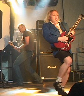 Höhepunkt des Jubelwochenendes war dann am Abend ein Rockfestival im Festzelt mit einer der angesagtesten AC/DC-Coverbands der Region. "AC/ID" schafften es in einer über zweistündigen Show, die Fans der australischen Hardrocker zu begeistern. Die Band kam dem Original sowohl soundmäßig als auch mit ihrer Performance ziemlich nahe. Sologitarrist Ralf Keßler gab in der Schuluniform mit kurzen Hosen eine überzeugende Angus-Young-Kopie, legte wie sein Vorbild einen Striptease hin und bahnte sich anschließend für sein Gitarrensolo den Weg durchs Publikum. Frontmann Joe Strubel ließ vor allem den verstorbenen ersten AC/DC-Sänger Bon Scott wiederauferstehen, hatte aber stimmlich auch mit den Songs von Brian Johnson einschließlich der neuen Single "Rock ´n´ Roll Train" keine Probleme. Bassist Stefan Schiemer und Drummer Jens Gellner sorgten für den beinharten AC/DC-Rhythmus. Geboten wurden alle Hits der Australier von den Anfängen in den 1970er Jahren bis heute.