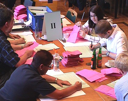 Freie Wähler und AGL gestärkt - CDU und SPD verlieren Das Team des Wahlbezirks Steigeschule. (Foto: Claudia Richter)Mehr Bilder (Klicken zum Vergrößern):