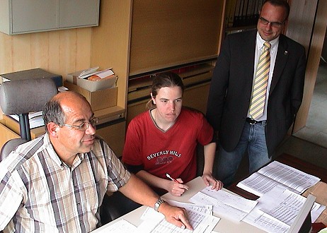 9:5 für die Freien Wähler Karlheinz Wagner, Claudia Straub und Bürgermeister Jan Frey bei der Stimmenauszählung im Schönbrunner Rathaus. (Foto: Claudia Richter)(hr) Auch in Schönbrunn wurde heute das Ergebnis der gestrigen Gemeinderatswahl ausgezählt.