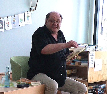 Spannende Geschichten vom Profi (Foto: Claudia Richter)(cr) Einen echten Buchautor zum Anfassen gab es heute in der Stadtbibliothek in Eberbach. Auf Einladung von Luzia Scharf, Leiterin der Bibliothek, kam am Vormittag Ulli Schubert in die Räume der Stadtbücherei und las den rund 70 Schülerinnen und Schüler der zweiten Klassen der Dr.-Weiß-Grundschule sowie den Lehrerinnen Justina Lechtenfeld, Cornelia Schäfer und Melanie Schönig aus seiner Buchserie "Die frechen Fußballfreunde" vor.