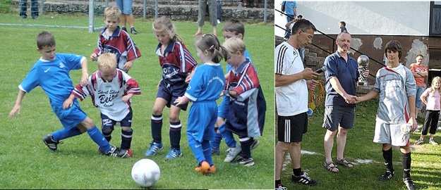 27 Stunden Fußball in vier Tagen mit 454 Toren Links: eine Szene aus dem Bambinispielfest. Rechts: Siegerehrung beim D-Jugend Turnier. (Fotos: privat)(bro) (ka) Mit dem Lumber Cup begann der sportliche Event anlässlich des 100-jährigen Jubiläums am Donnerstag, 11. Juni. Zehn Mannschaften, mit zum Teil ungewöhnlichen Namen, meldeten sich zum Kleinfeldturnier an, bei dem es schöne Spiele mit vielen Toren zu sehen gab. Die Teams von den Sportfreuden Brombach, "Bitte bereit halten", Junge Union 2 und SV Ersheim erreichten das Halbfinale. Hier ging die Mannschaft SV Ersheim nach Elfmeterschießen gegen "Junge Union 2" als Sieger hervor, während im anderen Halbfinale "Bitte bereit halten" die Oberhand behielt. "Junge Union 2" konnte das kleine Endspiel für sich entscheiden, und im einen spannenden Endspiel siegte SV Ersheim im Elfmeterschießen. Erster Vorstand. A. Körber nahm die Siegerehrung vor und bedankte sich bei den Teams für die faire Spielweise bei einem Turnier, das mehr Zuschauer verdient gehabt hätte, aber das Wetter spielte nicht richtig mit.