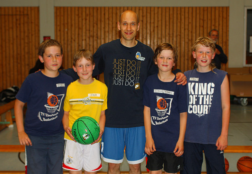 Eberbacher Basketballer beim DBB Minifestival in Heidelberg (Foto: privat)(bro) (hk) 170 basketballbegeisterte Jungen und Mädchen aus ganz Deutschland waren am vergangenen Wochenende nach Heidelberg gereist, um am Minifestival des Deutschen Basketballbundes im Sportzentrum Süd in Kirchheim teilzunehmen. Darunter befanden sich auch vier Jungen der Eberbacher U12 Mannschaft. Der Spaß am Spiel und an der Bewegung und die Förderung des sozialen Umgangs der Kinder untereinander sowie die Freude am gegenseitigen Kennenlernen standen bei dem dreitägigen Fest mit Übernachtung in der Sporthalle im Vordergrund. Deshalb waren die Eberbacher nicht als Turniermannschaft angetreten, sondern sie wurden auf Teams aufgeteilt, die von der Festivalleitung vor Ort neu zusammengestellt wurden. Neben dem Turnier legten die Eberbacher Basketballer alle erfolgreich das Spielabzeichen in Gold ab. Höhepunkt des Minifestivals, das von der TSG Ziegelhausen und der SG Kirchheim ausgerichtet wurde, war das Training mit Pascal Roller, Aufbauspieler der Frankfurter Skyliners und ehemaliger Aufbauspieler der Deutschen Nationalmannschaft, am Freitagabend. Der gebürtige Heidelberger zeigte Ballhandling und Dribbelübungen, und die Kinder waren mit Begeisterung dabei.