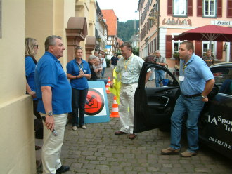 Stelldichein von 6000 PS am Alten Markt Startwagen mit Rallye-Begründern Hans-Peter Knab (2.v.r.) und Heinz Dillmann (vorne links), der auch moderierte. (Foto: Wörner)Mehr Bilder (Klicken zum Vergrößern):