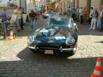 Stelldichein von 6000 PS am Alten Markt Jaguar E-Type von 1961 Team Mosca/Mosca. (Foto: Wörner)Mehr Bilder (Klicken zum Vergrößern):
