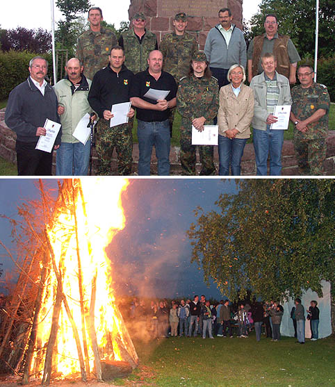 Waldbrunner Reservisten feierten mit Sonnwendfeier ihr Jubiläum Die Reservistenkameradschaft Waldbrunn feierte mit der diesjährigen Sommersonnwende gestern ihr 20jähriges Bestehen. Dabei wurde auch zahlreiche Mitglieder der RK geehrt. Unsere Fotos zeigen dabei in der oberen Reihe von links: OG.d.R. Wilhelm Ihrig, OG.d.R. Bernhard Knapp, Lt.d.R. Bernd Kiesling (Vorsitzender), Ortsvorsteher Paul Scholl und Ortschaftsrat Wolfgang Grimm. Untere Reihe HG.d.R. Günther Geppert, OG.d.R. Erwin Patzak, HG.d.R. Volker Steck, OG.d.R. Heribert Weidmann, SU.d.R. Thomas Baumgartner, Elke Schneider (Kreisgeschäftsstelle), OG.d.R. Gerhard Sigmund und KreisOrgLeiter HFw.d.R. Jürgen Hack. Das untere Foto entstand nach dem Entfachen des Sonnwendfeuers. (Fotos: Thomas Baumgartner)