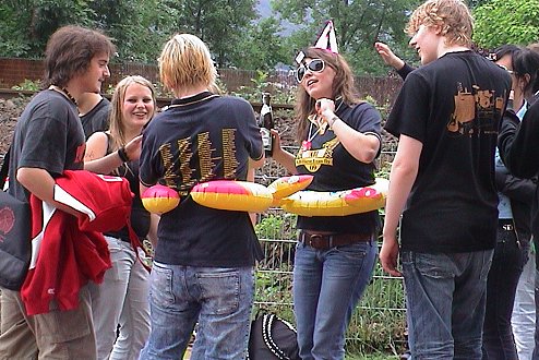 Und dann ging alles ganz schnell: Die Lehrkräfte wurden kurzerhand zu den vor dem Lehrerzimmer warteten Stewardessen geleitet und zu einem Sektumtrunk genötigt. Die Schüler und Schülerinnen mussten das Schulgebäude durch ein Sicherheitstor verlassen, an welchen zahlreiche Wachposten mit Wasserspritzpistolen ihre Arbeit sehr genau nahmen. Auf dem Sportgelände wurde anschließend bis nach 13 Uhr die Beachparty 2009 mit fetziger Musik und witzigen Spielen gefeiert.