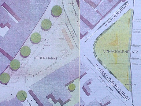 Neues Gesicht für Plätze in der Oststadt (Repros: Hubert Richter)(hr) Im Sanierungsgebiet an der Brückenstraße haben vor wenigen Wochen die Straßen- und Leitungsbauarbeiten begonnen. Ende 2010 soll alles fertig sein, und dann sollen auch die in dem Gebiet liegenden Plätze - der Neue Markt und der so genannte "Synagogenplatz" zwischen Brückenstraße und Adolf-Knecht-Straße ein neues Gesicht bekommen. Wie die Plätze dann aussehen sollen legte heute der Eberbacher Gemeinderat in den Grundzügen fest.