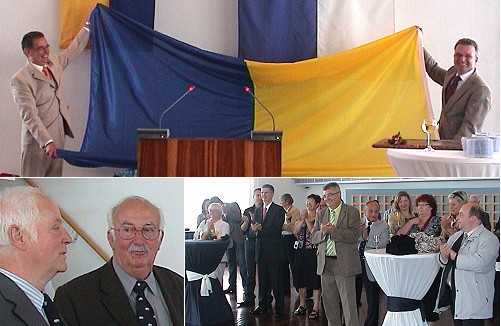 Unvergessliche Erlebnisse in Eberbach Eine große Thonon-Flagge überreichte Michel Pittet (l.) Bürgermeister Bernhard Martin. Unten links Altbürgermeister Horst Schlesinger im Gespräch mit Claude Richard. (Fotos: Claudia Richter)(cr) Eine Delegation aus Eberbachs französischer Partnerstadt Thonon-les-Bains war seit Freitag zu Gast in Eberbach. Gestern begrüßte Eberbachs Bürgermeister Bernhard Martin die Gäste vom Genfer See offiziell im Rathaus.