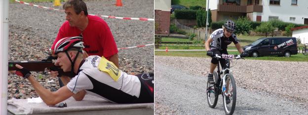 Mit einem Puls von 180 noch ins Schwarze treffen (Foto:privat)(jc) (tm) Am vergangenen Samstag fand nach dem Erfolg im letzten Jahr, der 2. Ittertaler Mountainbike-Biathlon am und um das Sportgelände in Kailbach statt. Von 57 gemeldeten Startern gingen letztendlich 46 Biker, darunter vier Frauen, ins Rennen über die fünf Kilometer lange und für einige recht anspruchsvolle Strecke, bei der 120 Höhenmeter zu überwinden waren. In jeder der drei zu absolvierenden Runden musste ein Halt am Schießstand des Schützenverein 1487 Eberbach e.V. eingelegt werden. Bei jedem Schießen durften fünf Schuss mit dem Luftgewehr auf die Biathlon-Scheibenanlagen abgegeben werden. Wenn nicht alle Geschosse ins Schwarze trafen, musste man sofort so viele Strafrunden von je 338 Metern fahren, wie man Fehlschüsse abgegeben hatte. Dies wurde vom Steckenpersonal strengstens überwacht.