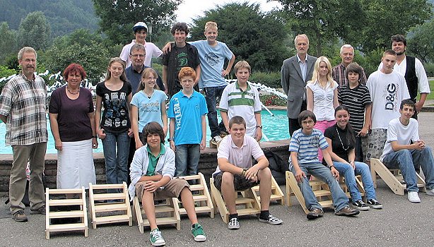 Zum Abschluss des Projekts trafen sich am Freitag, 26.Juni, alle an der Kooperation beteiligten Schüler und Lehrer in der Neckaranlage vor der Theodor-Frey-Schule und Günter Emig überreichte den 15 Teilnehmern ein Zertifikat über den erfolgreichen Abschluss des "Basiskurses zur handwerklichen Ausarbeitung von Holztreppen".