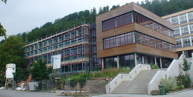 Ob die Stadtverwaltung die von ihr vermutete Nachlässigkeit des Architekten durch eine Honorarminderung ahnden kann, soll noch geprüft werden. Priorität hat jetzt aber die Fertigstellung des talseitigen Schulbaus (unser Bild) mit der Mensa bis zum Beginn des Ganztagesbetriebs im September - unter Federführung des bisherigen Architekten. Janner ist sicher, dass die Schule "in ihren Grundfunktionen" nach den Sommerferien in Betrieb gehen kann, auch wenn noch nicht alles fertig ist.