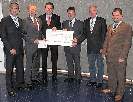Banken spenden 12.700 Euro (Foto: privat)(bro) (sch) "Gerade in wirtschaftlich weniger guten Zeiten, in denen auch das Spendenaufkommen zurückgeht, wissen wir Ihre Zuwendung sehr zu schätzen", erklärte Landrat Dr. Achim Brötel (dritter von re.) in seiner Funktion als Vorsitzender der Schlossfestspiele Zwingenberg e.V. bei der Entgegennahme eines Schecks über 12.700 Euro. Diese Summe stellen die Volksbank Mosbach, vertreten durch Bankdirektor Klaus Saffenreuther (dritter von li.), die Volksbank Neckartal, vertreten durch Bankdirektor Ekkehard Saueressig (zweiter von li.) und der Baden-Württembergische Genossenschaftsverband, für den Claus-Peter Göttmann (li.) anwesend war, den Schlossfestspielen zur Verfügung. Geld, das im Kulturbetrieb dringend gebraucht wird. Dafür wird aber auch ein tolles Programm geboten, wie der stellvertretende Vorsitzende der Schlossfestspiele, Peter Kirchesch (zweiter von re.) und Geschäftsführer Michael Keilbach (re.) betonten. Das startet in diesem Jahr bereits am kommenden Sonntag: mit Live-Musik bei einem Jazzfrühschoppen ab 11 Uhr am Naturfreundehaus Zwingenberg.