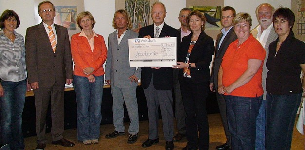 Unser Bild zeigt Volksbank-Vorstand Ekkehard Saueressig (2. v.l.), den Vorstandsvorsitzenden Herbert Hinterschitt (mit Scheck) sowie die Vertreterinnen und Vertreter der Gewerbevereine.