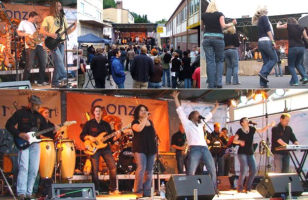 Rock und Soul im Fabrikhof "Gonzo & The Loonies" (unten) sorgten für eine fetzige Soulparty. Oben links die Vorgruppe "Airspoon". (Fotos: Hubert Richter)(hr) Zum siebten mal organisierte gestern Abend der HCV Lachsbachperle den "Fabrikrock" in Hirschhorn.