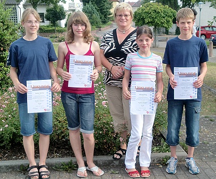 Vierter DHV-Jugendwettbewerb mit Bravour gemeistert Die glücklichen Preisträger/innen mit ihren Urkunden: Stefanie Spreng, Klara Büchler, Michelle Ihrig, Manuel Rupp mit Ute Zimmermann (v.l.). (Nicht auf dem Bild: Johanna Seidel). (Foto: privat)